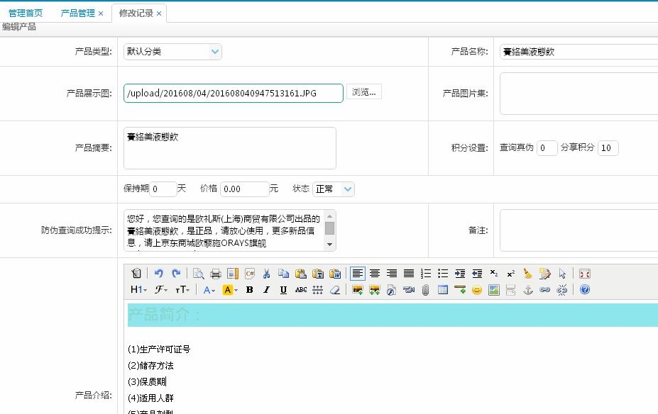 產(chǎn)品管理涉及到最終消費者查詢顯示的大部分信息,包括頂上的產(chǎn)品名稱、產(chǎn)品圖片,真?zhèn)挝淖中畔ⅲa(chǎn)品的詳細(xì)信息。