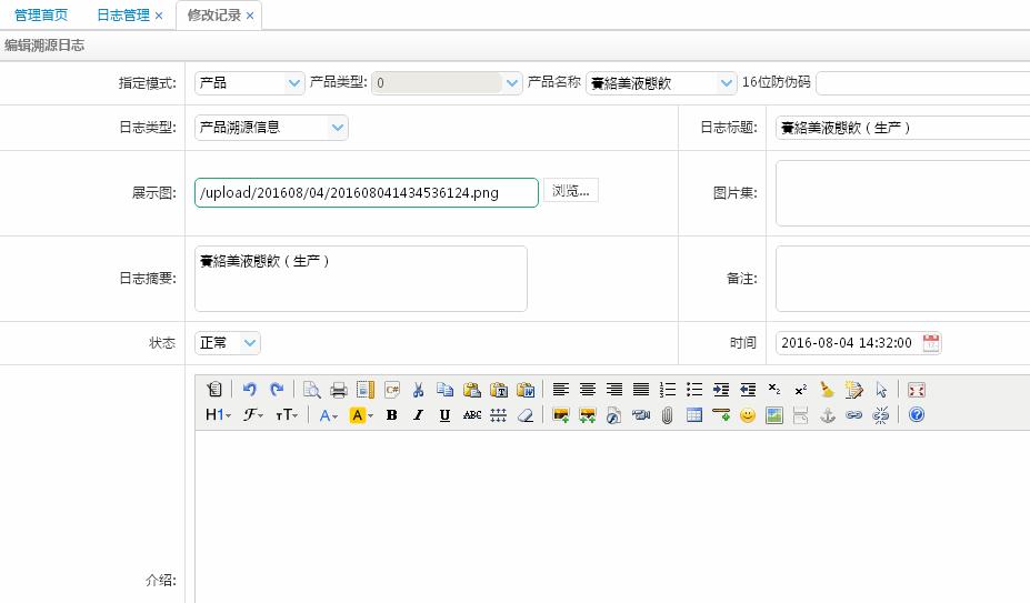 日志管理可以設(shè)定具體的溯源信息,即設(shè)定產(chǎn)品在每個關(guān)鍵生產(chǎn)工序以及流通環(huán)節(jié)的相關(guān)信息及照片。