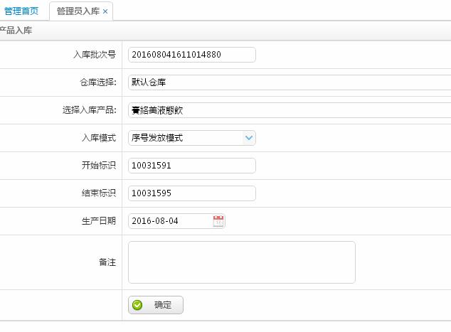 入庫管理中,倉庫選擇默認(rèn)倉庫,選擇相應(yīng)的產(chǎn)品,入庫模式很重要,是選擇序號發(fā)放模式,只有選擇此項,后面才有開始標(biāo)識和結(jié)束標(biāo)識。號碼段是從小到大。