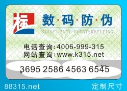 數(shù)碼防偽原理是為每一件入網(wǎng)的產(chǎn)品設(shè)置一個(gè)唯一的編碼,并把這一編碼儲(chǔ)存在中心數(shù)據(jù)庫中,同時(shí)建立起全國性的電話(手機(jī)或網(wǎng)絡(luò))查詢驗(yàn)證系統(tǒng)。消費(fèi)者購買到貼有數(shù)碼防偽標(biāo)簽的商品,只需撥打電話或上網(wǎng)或掃描二維碼,輸入商品上的編碼,即可知道產(chǎn)品的真?zhèn)?,從而突破了傳統(tǒng)的防偽產(chǎn)品容易被批量防冒及消費(fèi)者不易識(shí)別的局限性。